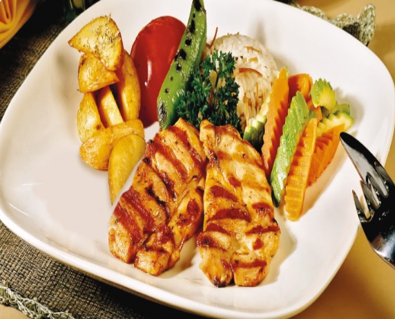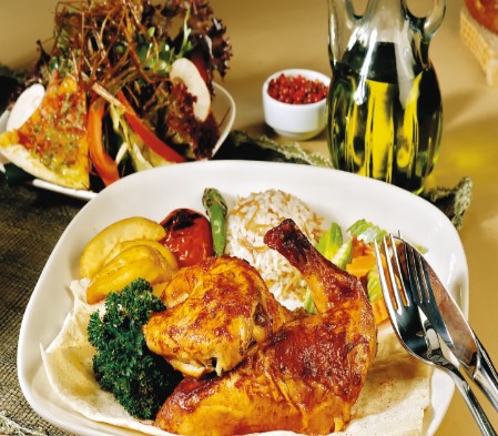 Kızarmış yarım tavuk pilav karışık sebze garnitür ve kaşık patates ile servis yapılır