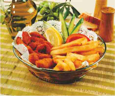 Panelenmiş Piliç parçacıkları nuget sosis ve kaşık patates üzerinde servis edilir