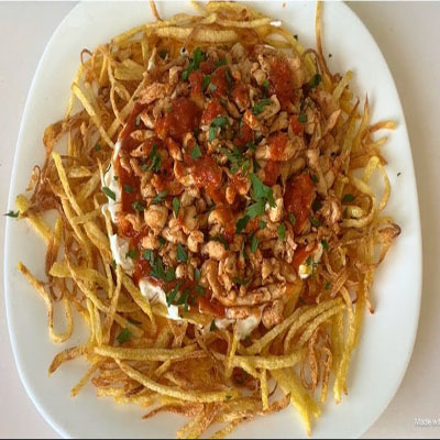 İnce dilimlenmiş patates üzerinde tavada baharatlarla sotelenmiş tavuk yoğurt ve ızgara edilmiş domates ve biber ile servis edilir