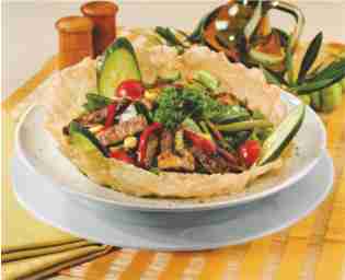 Dilimlenmiş şerit dana eti ve tavuk eti biber mantar mısır soya sosu ve oyster sosu ile birlikte akdeniz yeşillikleri uzerınde servis edilir.