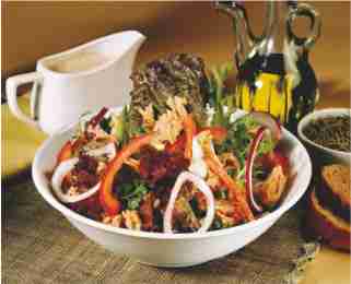 Akdenız yeşillikleri üzerıne domates salatalık ton balığı kuru soğan mısır ve sosları ile birlikte servıs yapılır