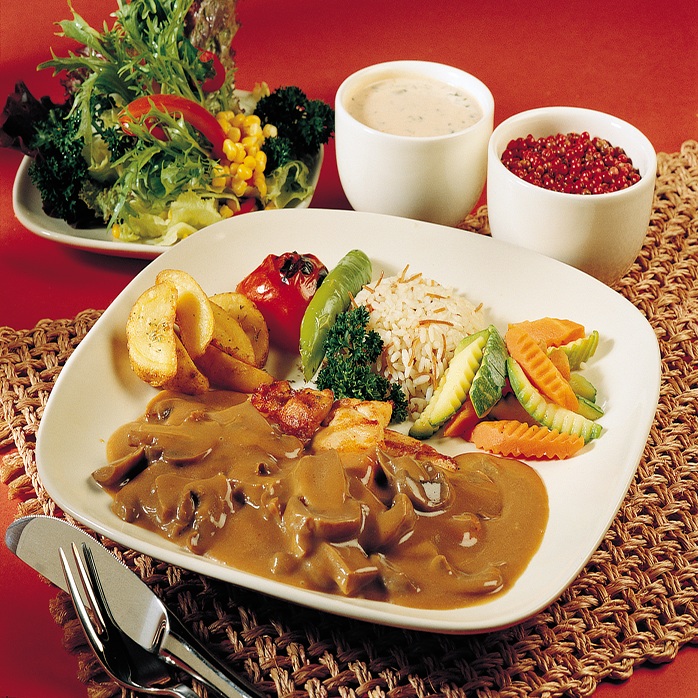 Karışık sebze garnitür , pilav ve kızarmış kaşık patates ile servis edilir.